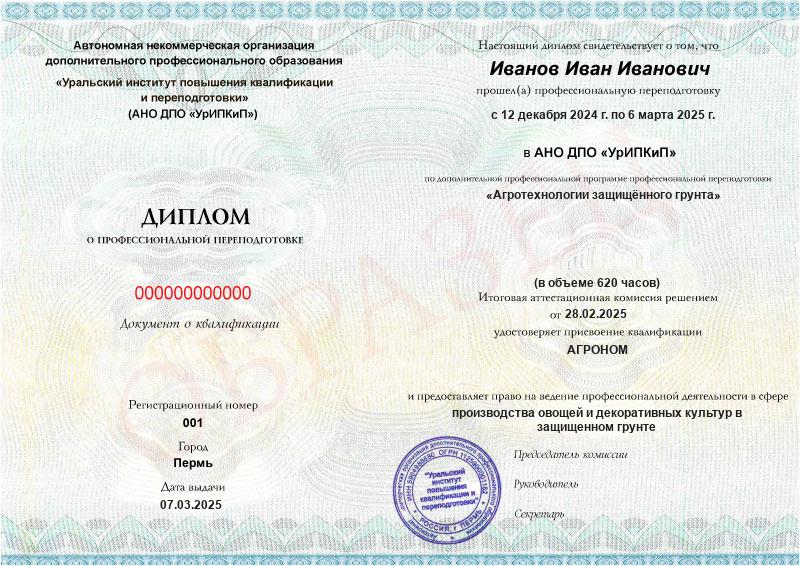• Диплом о профессиональной переподготовке с присвоением квалификации «Агроном». Вносится в Федеральный реестр документов об образовании.