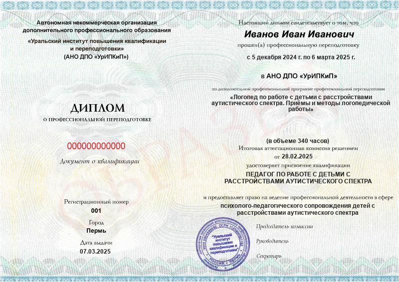 Да, дипломы и удостоверения оформляются в соответствии с действующим законодательством РФ. Документы печатаются на специальных бланках, заверяются печатью АНО ДПО «УрИПКиП».