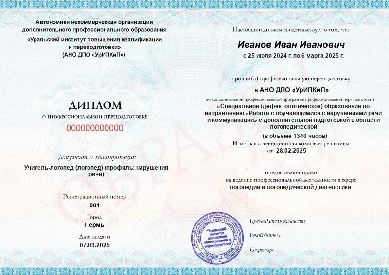 Специальное (дефектологическое) образование по направлению «Работа с обучающимися с нарушениями речи и коммуникации» с дополнительной подготовкой в области логопедической диагностики (1340ч)