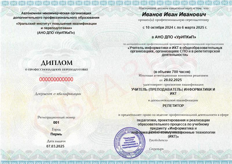 - Образец диплома о профессиональной переподготовке.