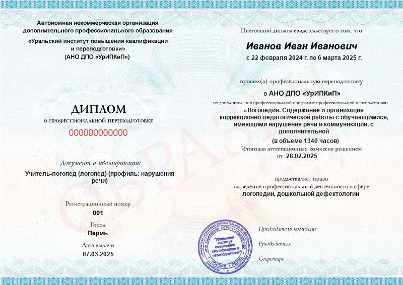 - Образец диплома о профессиональной переподготовке.