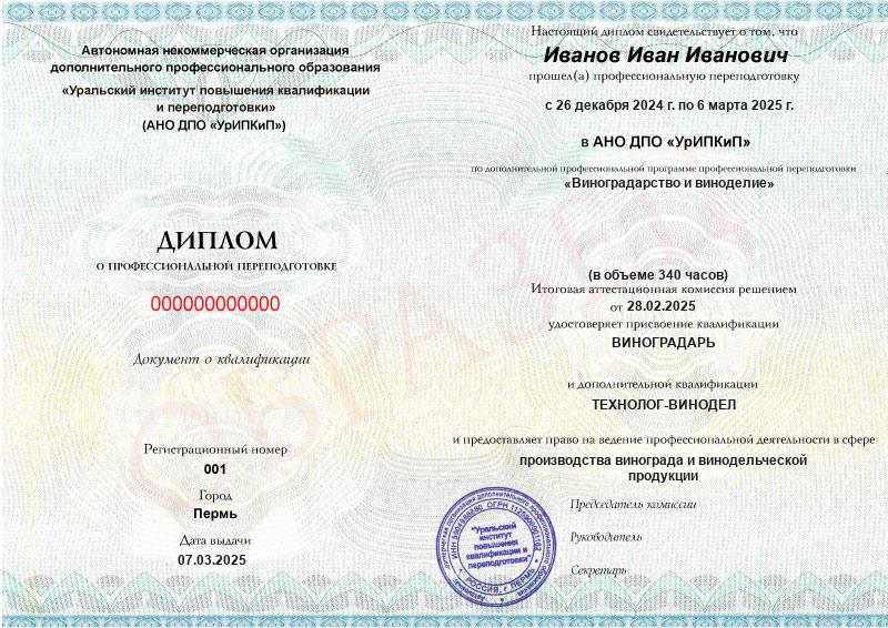 • Диплом АНО ДПО «МАСХ» с присвоением квалификации «Виноградарь» и доп. квалификации «Технолог-винодел» в сфере производства винограда и винодельческой продукции.